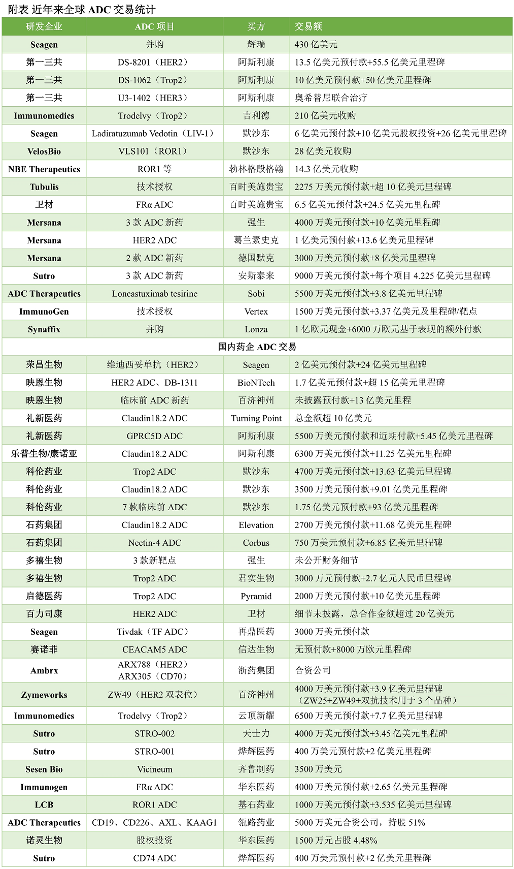 中国ADC新药正在扮演越来越重要的角色,荣昌生物HER2 ADC已经上市,科伦博泰HER2 ADC已经递交上市申请。同时,国产ADC频频完成授权出海合作,包括科伦博泰、荣昌生物、石药集团、映恩生物、康诺亚/乐普生物、启德医药、百力司康、礼新医药等。