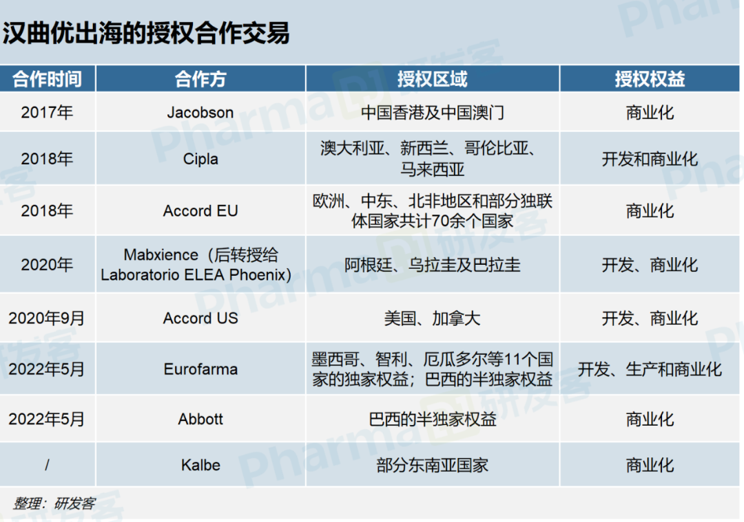 授权出海是当下国产生物类似药布局全球市场的主要方式。研发客观察到,复宏汉霖合作的海外药企不乏Accord、Abbott、Eurofarma、Organon等在当地实力雄厚、生物类似药领域推广经验丰富的制药巨头。