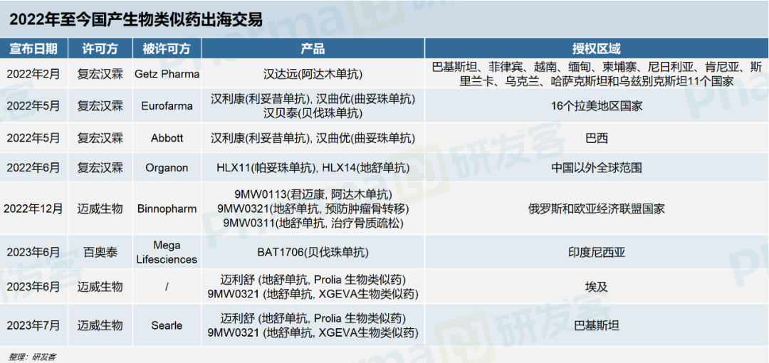 复宏汉霖等众多中国公司竞相开启了生物类似药出海授权之路(见下表)。2022年至今,迈威生物共达成3笔生物类似药海外授权交易,与Searle、Binnopharm等当地企业合作,覆盖巴基斯坦、俄罗斯等新兴市场。信达生物也分别与Coherus、Etana达成达攸同(贝伐珠单抗)在美国、加拿大和印度尼西亚的商业化权益。