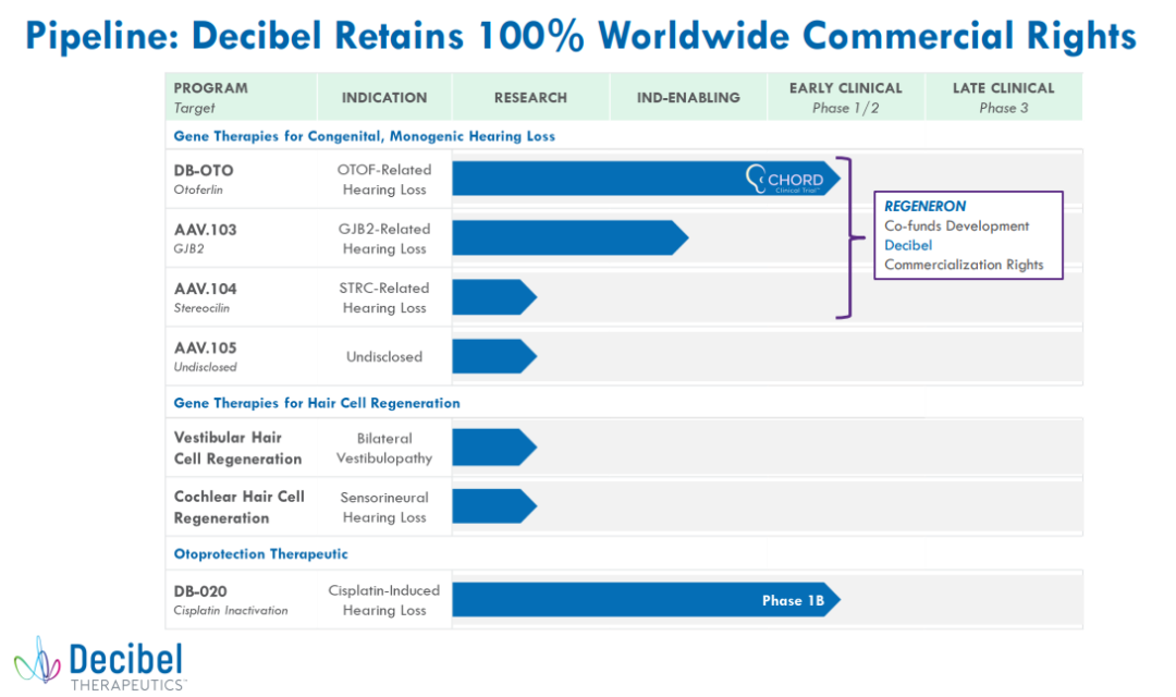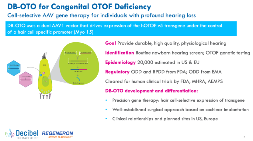 Decibel是一家专注于针对听力障碍开发基因治疗药物的生物技术公司。Decibel 和 Regeneron 于 2017 年建立了初步合作,并于 2021 年宣布延长其合作,目前正在开发三种针对不同形式的先天性、单基因听力损失的基因治疗项目。其中,DB-OTO 目前正在进行全球 1/2 期临床试验,此疗法是一种针对因otoferlin基因突变导致听力损失的患者的基于双AAV载体的基因疗法,搭载的治疗基因在毛细胞特异性启动子 (Myo 15) 的控制下启动基因的表达,该疗法通过标准的人工耳蜗植入手术给药。
