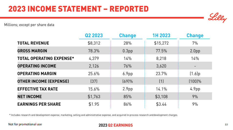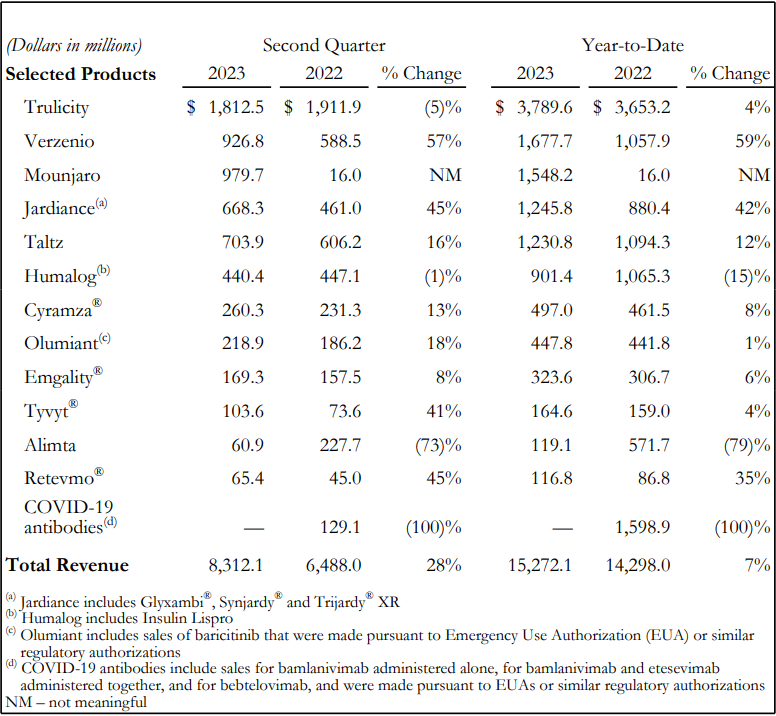 销售额的增长主要依赖于最新的重磅降糖药Mounjaro(Tirzepatide,替尔泊肽)的快速放量,上半年销售额15.48亿美元,其中第二季度卖出9.8亿美元,预计全年销售额将超过40亿美元。