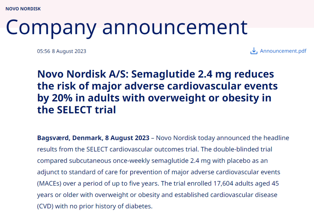 在礼来发布财报的同日,另一家代谢病药物巨头诺和诺德宣布,司美格鲁肽2.4mg剂量治疗可以将超重/肥胖患者的副作用心血管事件风险降低20%,当日股价大涨17%,市值首次突破4000亿美元。