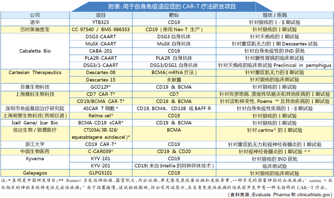 与扎堆CAR-T治疗肿瘤那样,大药厂对这个新治疗方向同样齐驱并进。除了前文提及的诺华,百时美施贵宝也即将开始对使用Nex-T生产的BMS-986353用来治疗狼疮开展Ⅰ期试验工作;强生最近获得了C-CAR039的许可交易(中国生物医药公司正在对视神经脊髓炎测试的一项资产),尽管这项交易仅限于淋巴瘤。