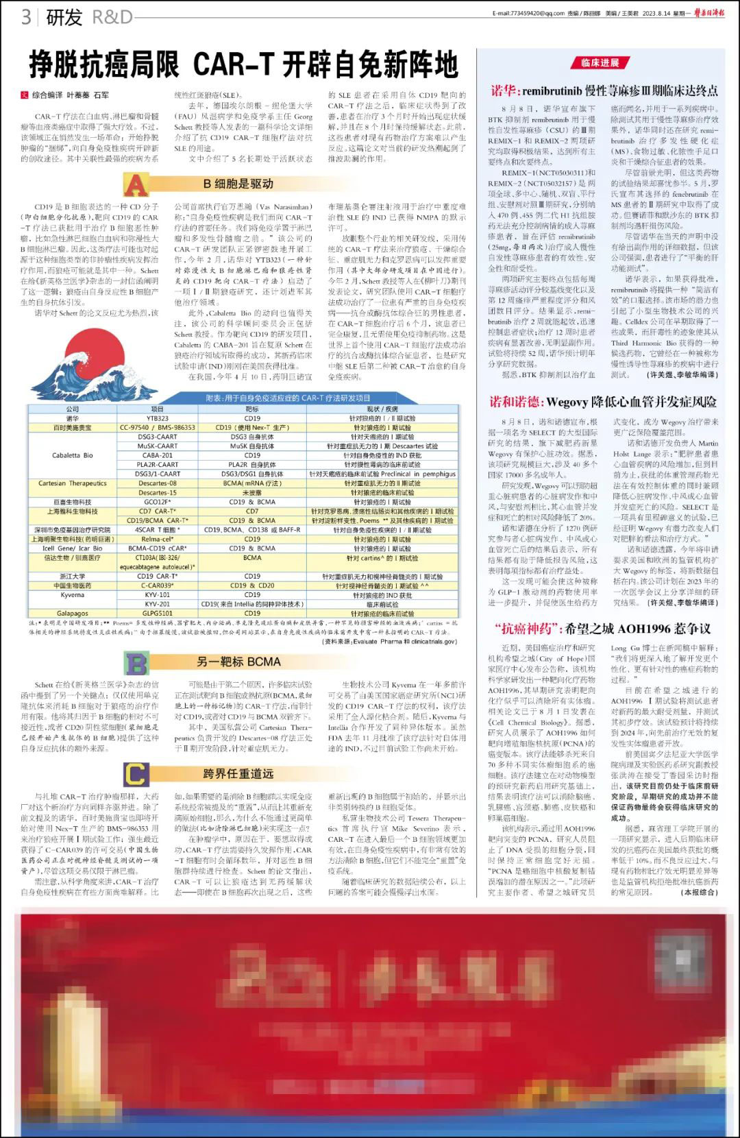 文中介绍了5名长期处于活跃状态的SLE患者在采用自体CD19靶向的CAR-T疗法之后,临床症状得到了改善,患者在治疗3个月时开始出现症状缓解,并且在8个月时保持缓解状态。此前,这些患者对现有药物治疗方案难以产生反应。这篇论文对当前的研发热潮起到了推波助澜的作用。