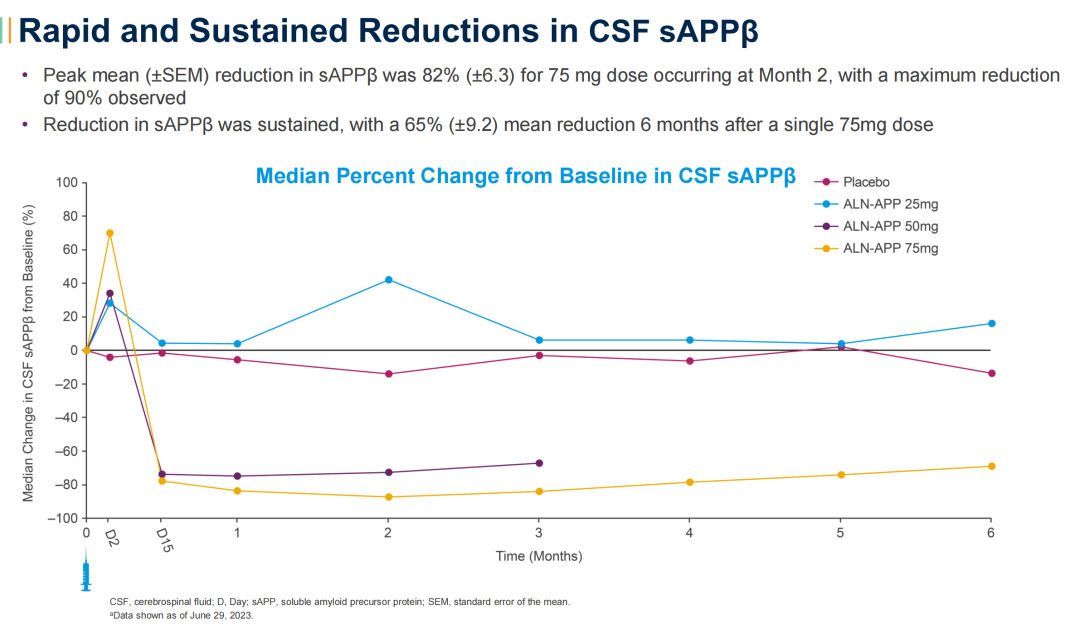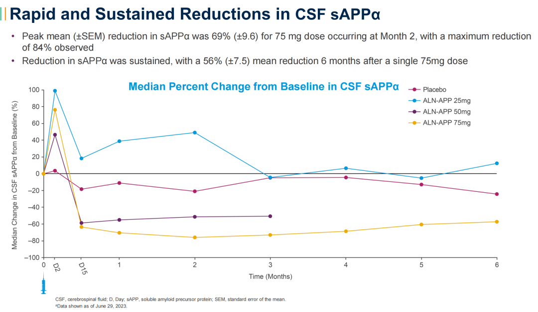 ALN-APP是一款靶向淀粉样前体蛋白(APP)的siRNA在研疗法,此次1期临床中期数据,特别提到ALN-APP 75mg单次给药,患者脑脊液中的可溶性APPα(sAPPα)和可溶性APPβ(sAPPβ)最大降幅分别可达84%和90%,在6个月时sAPPα平均降幅仍大于55%,sAPPβ大于65%。除此以外,接受单次鞘内注射的20位患者,都对 ALN-APP耐受性良好,仅出现轻至中度不良反应。