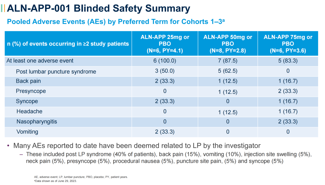全球有不少公司已快速跟进产品布局,部分公司留意到产品技术改良的机会。在ALN-APP报告的数据中,研究者认为有相当比例不良反应由鞘内注射导致(见下图),因此,他们开展研究,优化递送、核酸修饰等相关技术平台,继续提升siRNA基因沉默效率,降低鞘内注射引起的不良反应等。