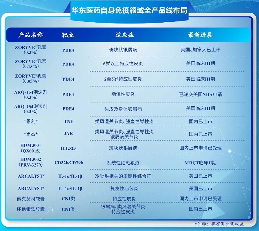 在自免领域,华东医药已拥有在研生物药和小分子创新产品 10 余款,该公司现有产品及在研产品适应症涵盖移植免疫、系统性红斑狼疮、银屑病、特应性皮炎、脂溢性皮炎、复发性心包炎、冷吡啉相关的周期性综合征(CAPS)等适应症,覆盖皮肤、风湿、心血管、呼吸、移植等疾病种类,是国内自身免疫性疾病领域种类覆盖较为全面的医药公司之一。