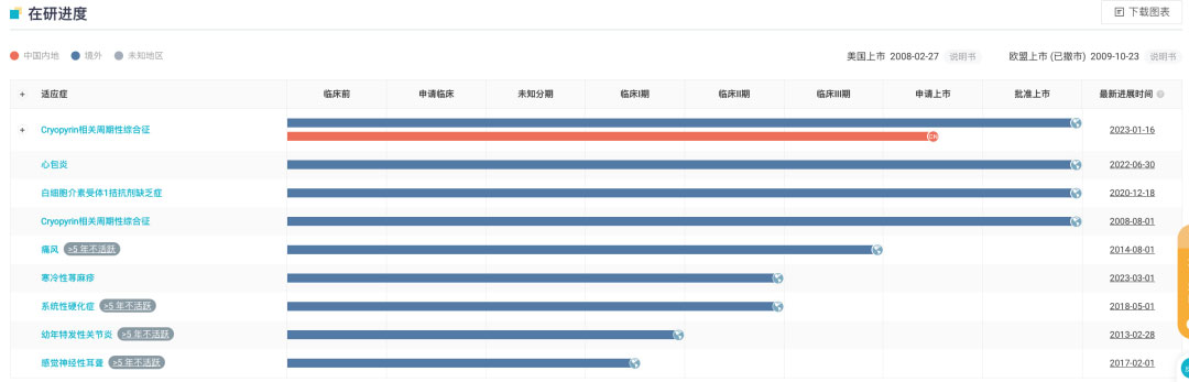 华东医药引进的 ARCALYST®(利纳西普)是美国 FDA 批准的唯一一款适用于 12 岁及以上人群的治疗复发性心包炎药物,在国内被列入临床急需境外新药目录,该公司预计于 2023 年正式向 NMPA 递交 ARCALYST® CAPS 适应症的 BLA 申请。