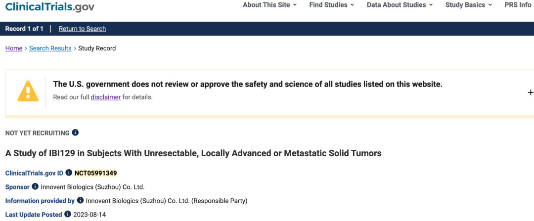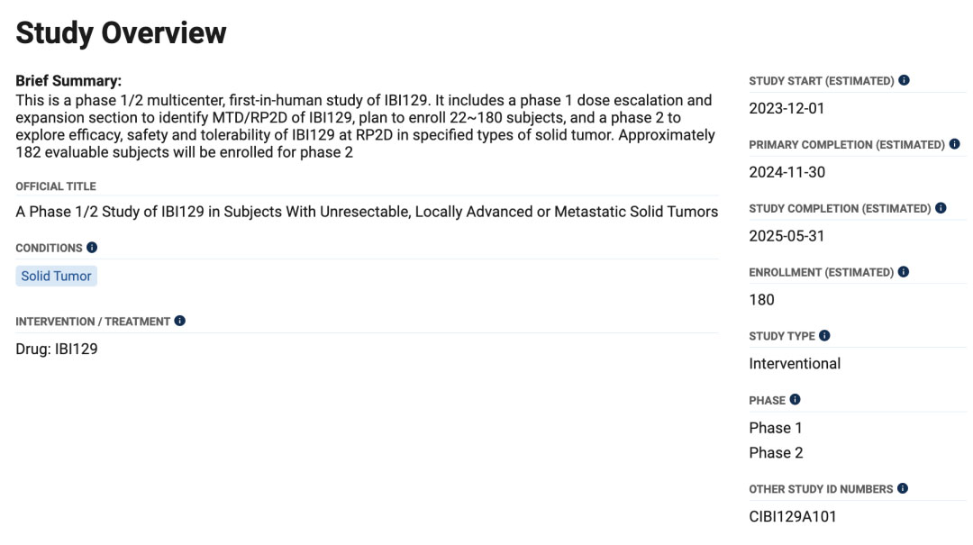8 月 14 日,据 ClinicalTrials.gov 官网显示,信达登记发布了一项 B7-H3 ADC IBI129 I/II 期临床试验(登记号:NCT05991349)。