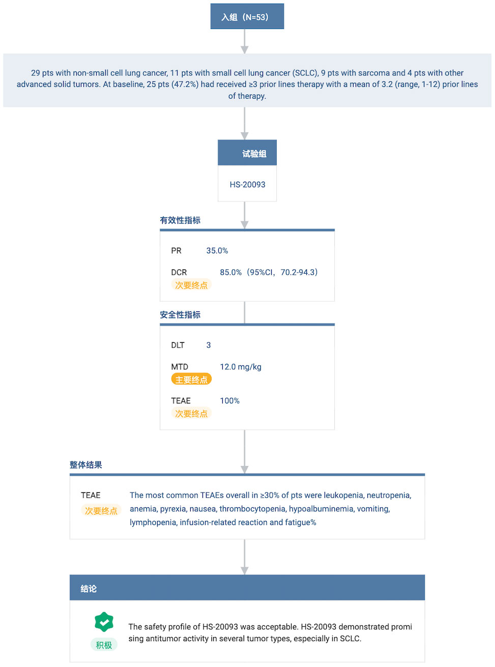 根据 HS-20093 的一项多中心、开放标签 I 期首次人体临床试验 ARTEMIS-001(登记号:NCT05276609)显示,截至 2023 年 3 月 10 日,剂量递增阶段共入组 53 例受试者(未筛选靶点,回顾性检测 B7-H3 蛋白表达),包括非小细胞肺癌、小细胞肺癌、骨及软组织肉瘤、食管癌、黑色素瘤和乳腺癌。