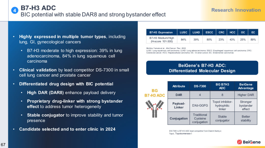 此外,百济神州也在布局同类产品,根据百济神州公布的 ADC 早期数据显示,B7-H3 ADC DAR 值为 8,毒素为拓扑异构酶抑制剂,采用亲水性 linker,偶联方式更为稳定。