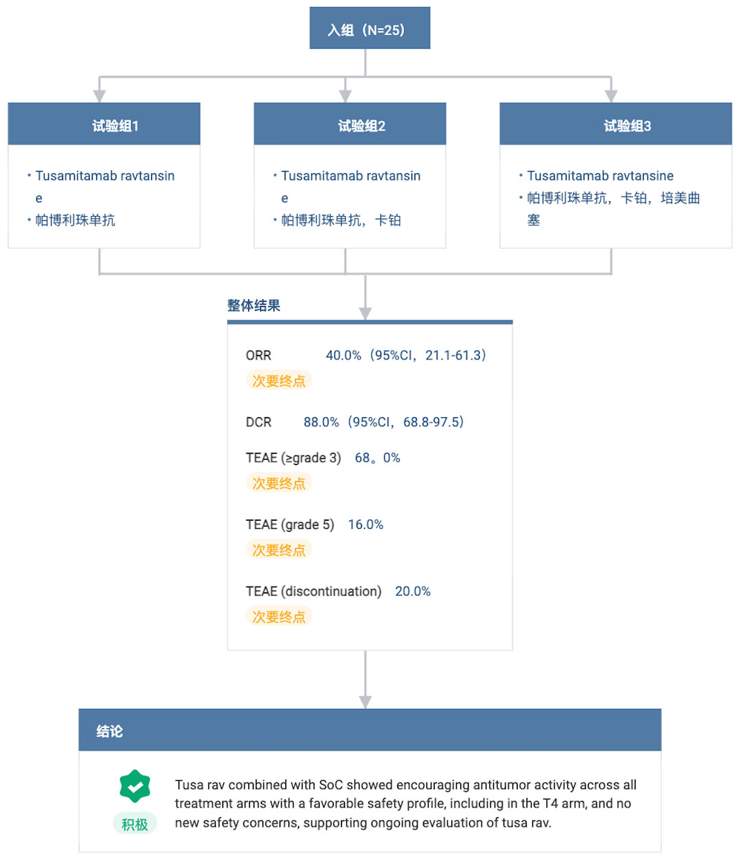 截至 2022 年 11 月 28 日,25 例患者接受了中位 21 周的治疗;48% 患者仍在接受治疗。结果显示,所有患者的客观缓解率(ORR)为 40%,疾病控制率(DCR)为 88%。安全性方面,Tusamitamab ravtansine 150 或 170mg/m2(Q3W)安全且可耐受。