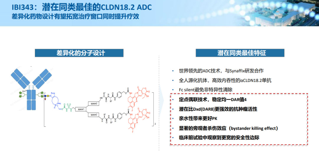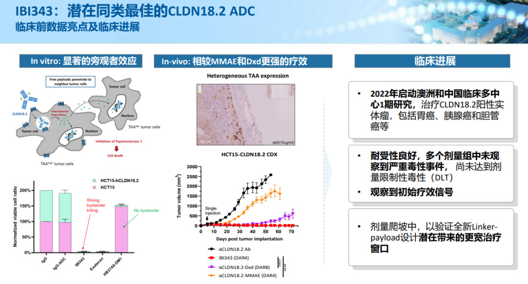 IBI343 靶向 CLDN18.2,采取定点偶联技术,DAR 值稳定为 4,具有显著的旁观者效应,潜在比 Dxd(DAR8)抗肿瘤活性更强效,在临床前观察到更宽的安全性边际。