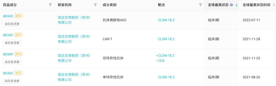而对于信达而言,针对该靶点,分别对应布局了 4 种成分类别的新药管线,除 ADC IBI343 外,布局的 CAR-T、双抗、单抗也均有产品进入临床。
