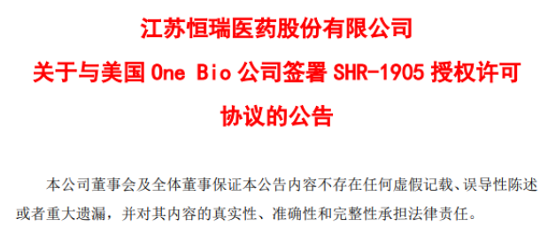 根据恒瑞发布的公告,宣布日前已与美国One Bio达成协议,将具有自主知识产权的1类新药SHR-1905注射液(以下简称“SHR-1905”)项目有偿许可给 One Bio。其中包括2150万美元的首付款和为SHR-1905的首个海外临床Ⅱ期试验提供一定数量的样品后获得的350万美元的近期里程碑付款,后续研发及销售里程碑款最高达10.25亿美元,销售额提成两位数。