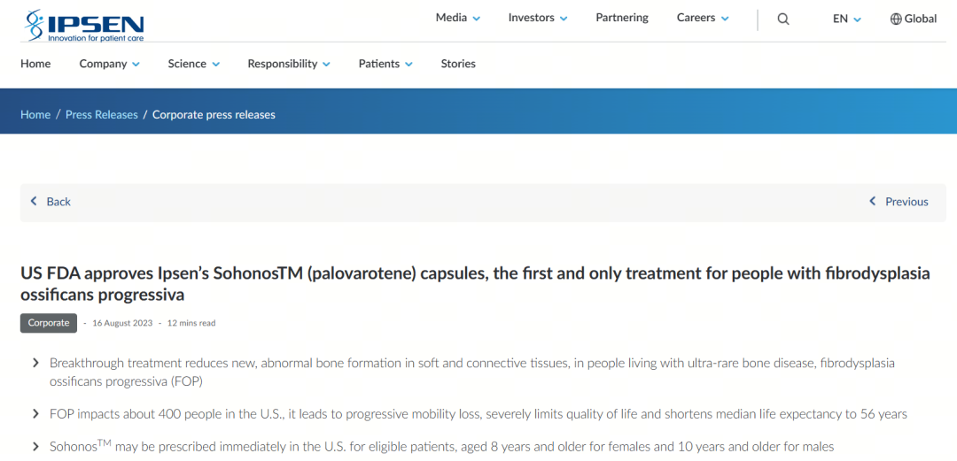 8月16日,益普生宣布帕罗伐汀(palovarotene)获FDA批准用于治疗儿童(8岁及以上女童和10岁及以上男童)和成人进行性肌肉骨化症(FOP)患者。辗转两年多,这款产品终于在美国上市了。