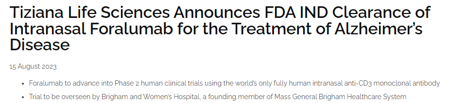 8月15日,Tiziana宣布其阿尔兹海默症药物foralumab获FDA批准临床。