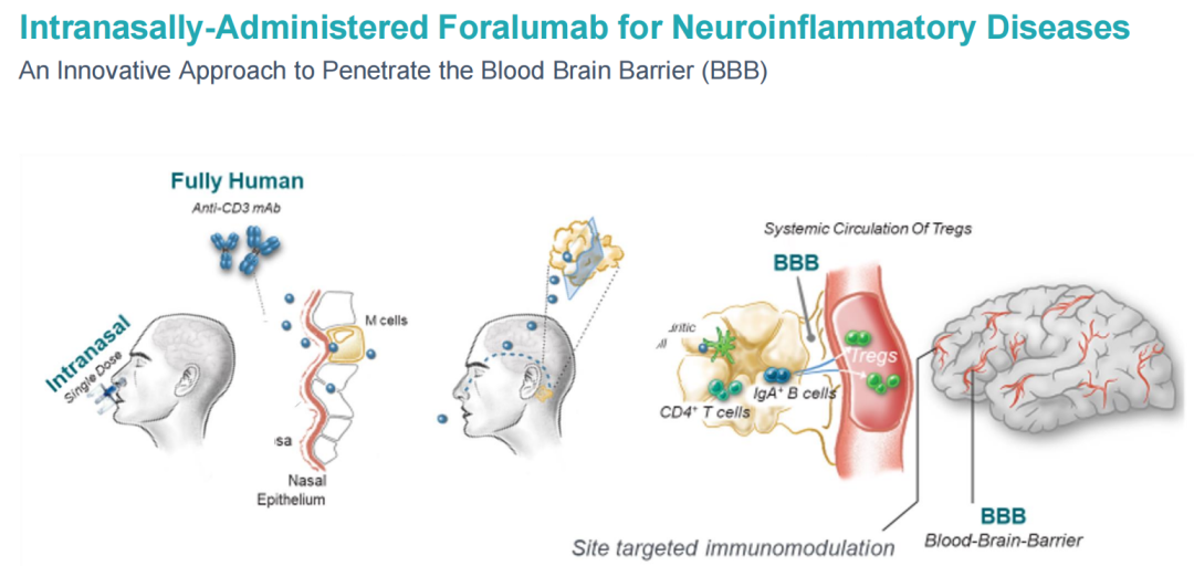 同时采用鼻腔局部给药,鼻内给药毒性最小,保证安全性的同时可局部诱导调节性T细胞,然后迁移到大脑以抑制脑部炎症,可治疗多种CNS疾病。
