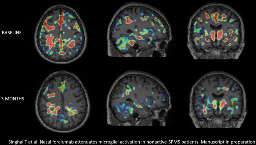 此前,Tiziana在6名鼻内 Foralumab 扩大使用的非活动性SPMS患者中,3个月内观察到5名小胶质细胞活化减少。