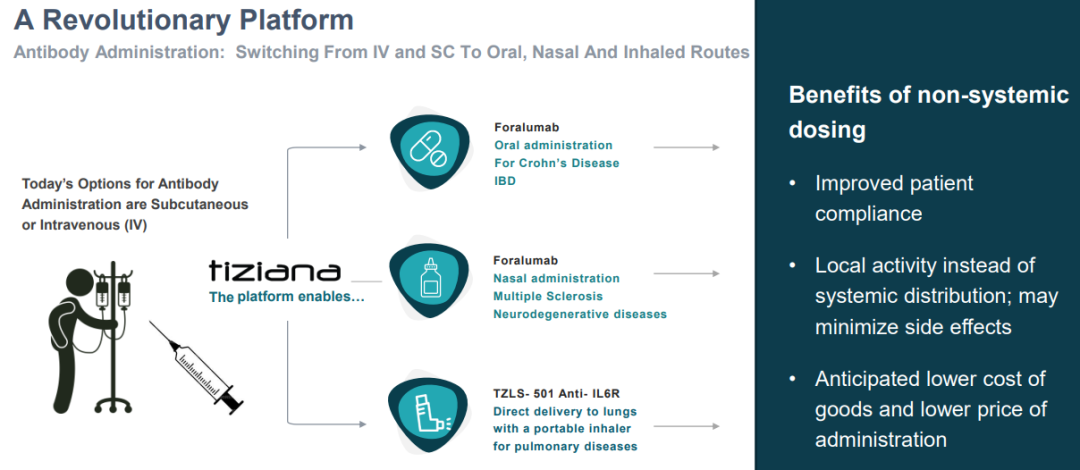 Tiziana旨在利用变革性给药技术开发突破性疗法,以实现免疫疗法的替代途径,目前抗体药物多为注射给药,Tiziana开发了口服,鼻腔递送疗法。