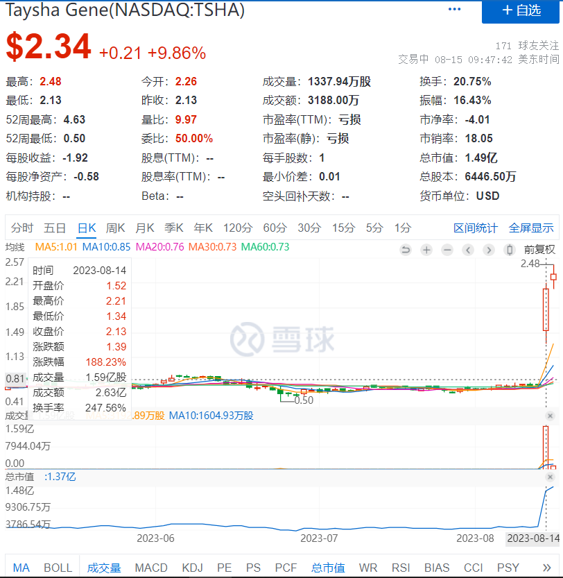 同日,Taysha报告了首例成年rett综合征患者在I/II期临床试验中的积极的初步临床数据,并提供了公司2023年第二季度财务业绩的最新数据。受这些消息影响,当天Taysha股价大涨188%,市值达1.37亿美元。