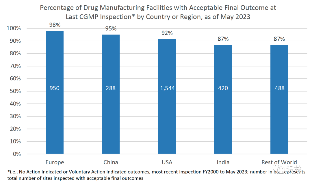 按国际或地区分类的最后一次 CGMP 中最终结果可接受的药品生产场地百分比(截至 2023 年 5 月)