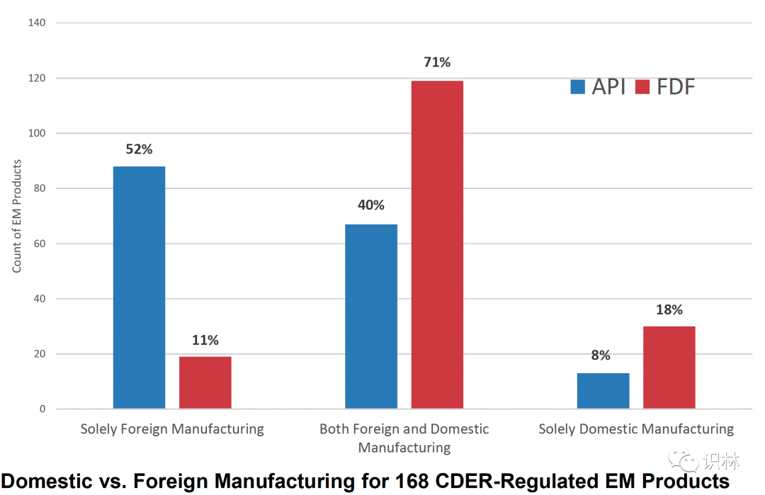FDA 制定了一份基本药物清单,并提供了其中有多少药物全部或部分在美国以外的国家生产的计算结果。FDA 还调查了这些药品的原料药中有多少是在海外生产的。值得注意的是,尽管 92% 的原料药全部或部分在国外生产,但只有 11% 的成品完全在国外生产。