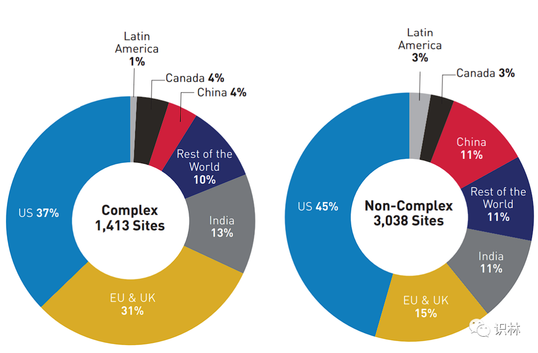 而对于复杂产品生产场地的分析,68% 此类设施位于美国、欧盟或英国,13% 在印度,4% 在中国;相比之下,60% 的非复杂产品场地位于美国、欧盟或英国,11% 在印度,11% 在中国。