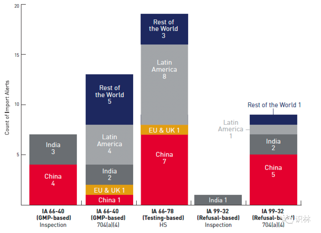 进口禁令方面,2021 财年,中国是收到进口禁令最多的国家。这一数据可参考《FDA 2021 财年药品质量状况报告》。