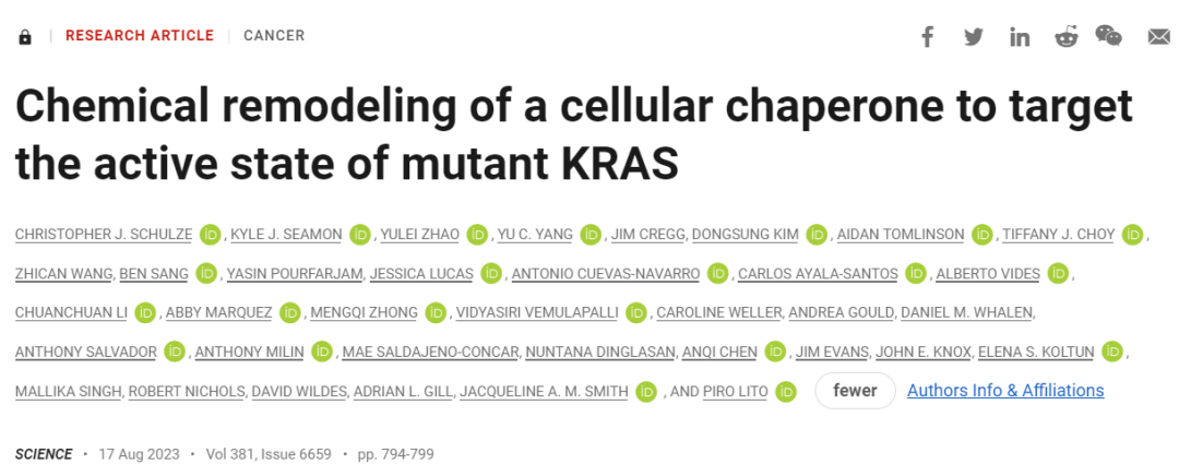 KRAS蛋白曾经是著名的“不可成药”靶点,它的表面光滑,没有明显可供小分子药物结合的“口袋”。不过,科学家发现KRAS G12C突变体的半胱氨酸可以被共价小分子药物靶向,这一突破最终带来了FDA批准的两款KRAS抑制剂sotorasib和adagrasib。不过这些抑制剂均靶向KRAS G12C突变体的失活状态,而且患者可能接受治疗后产生耐药性。