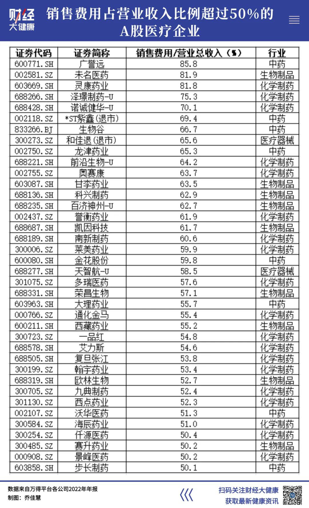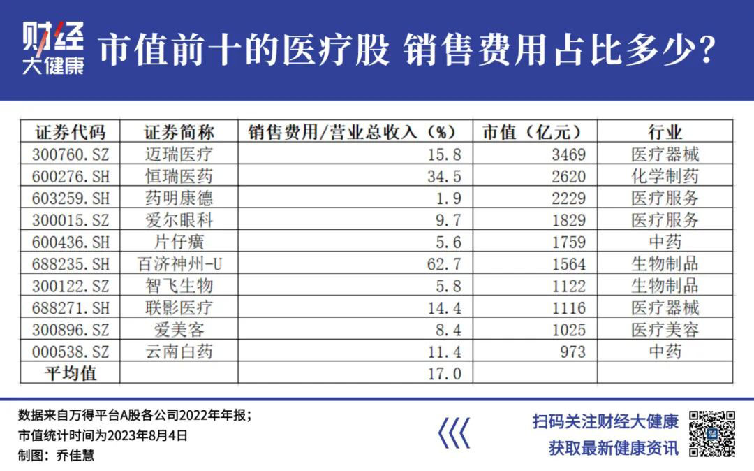 《财经》以A股488家医药企业为样本,观察到在2022年,这些企业支出3523亿元的销售费用。也就是说,A股医药企业平均每家的年销售费用约为7.2亿元。