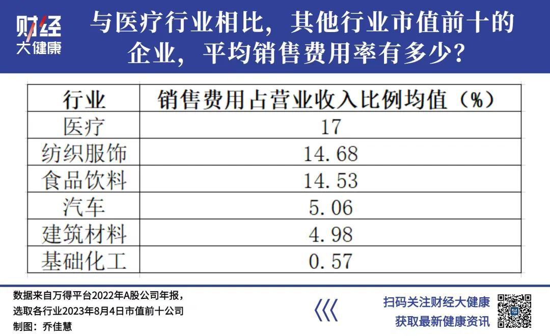 《财经》选取纺织服饰、食品饮料、汽车、建筑材料、基础化工等行业,同样以市值前十的龙头公司销售费用占营业收入比例取平均值,对比发现医药行业仍然是最高的。