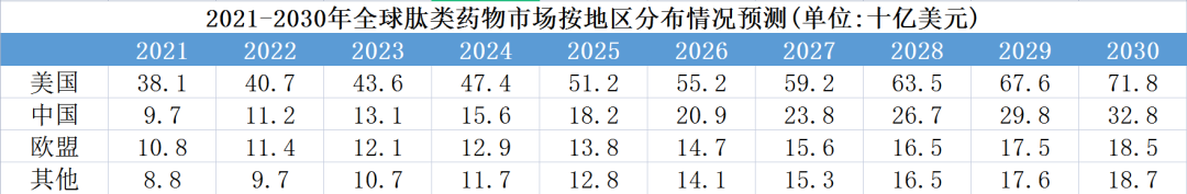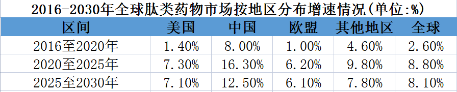 据Frost & Sullivan数据,全球肽类药物市场预计于2025年增至960亿美元,2030年将达到1419亿美元,是增长第二快的药物类别。我国的肽类药物市场将从2020年的85亿美元增至2025年的182亿美元,复合年增长率为16.3%;预计2030年增至328亿美元,2025年至2030年的复合年增长率为12.5%。增速将高于美欧。