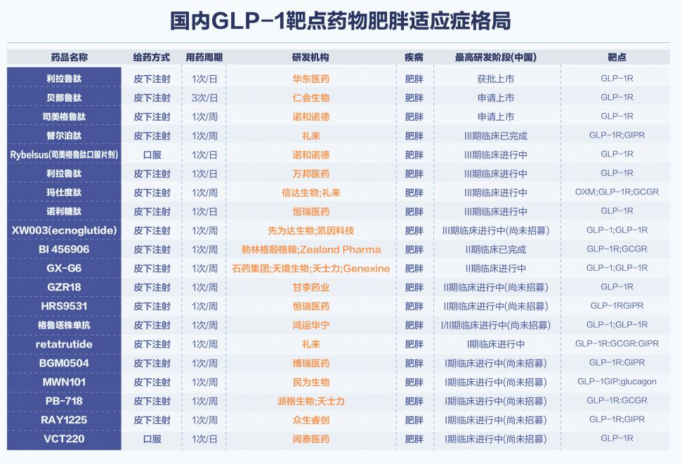 国内GLP-1靶点药物肥胖适应症格局 来源:21世纪新健康研究院、公开信息