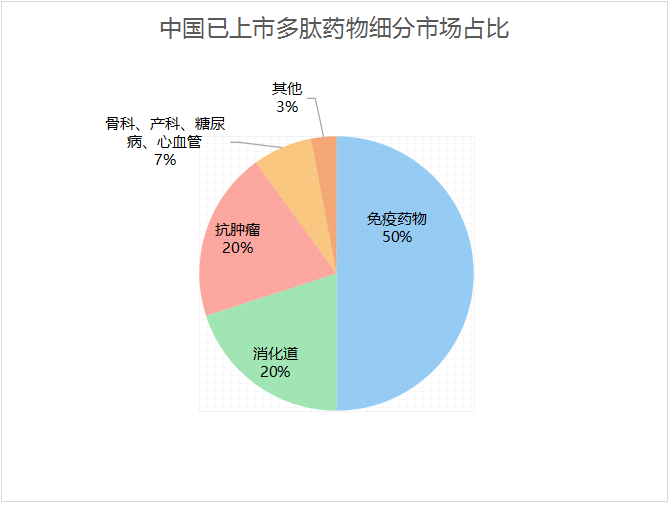 相比较代谢领域多肽药物的弱势,中国免疫领域的多肽药物则占据多肽药物一半的市场,其中主要集中在胸腺五肽、胸腺法新、生长抑素等大宗多肽品种。