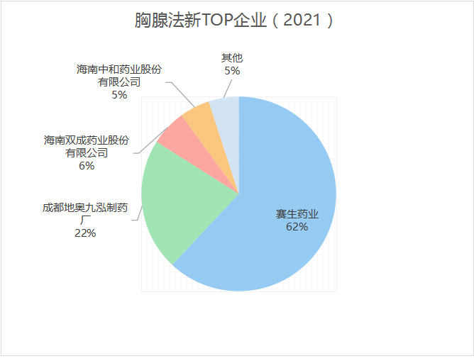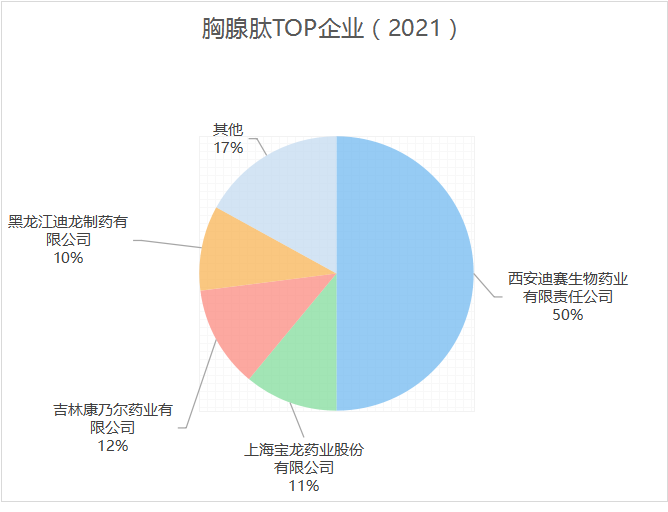 胸腺肽市场中占比最高的是西安迪赛,占据半壁江山;其次为上海宝龙、吉林康乃尔和黑龙江迪龙,分别占约10%。胸腺五肽,北京世桥与海南中和各占约25%,北京双鹭、深圳瀚宇与武汉华龙共同瓜分剩下的市场。胸腺法新,赛生药业的原研产品,占据62%的市场份额,成都地奥紧随其后,销售额占比22%。
