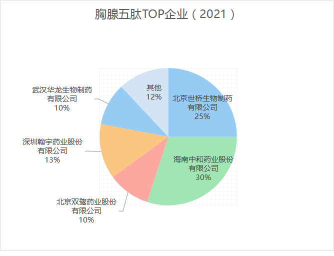 涉足胸腺五肽的企业主要有海南中和药业、北京世桥生物制药、深圳瀚宇药业、北京双鹭药业、武汉华龙生物制药等。据中国医药工业信息中心PDB药物综合数据库,在样本医院中,胸腺肽类药物占免疫刺激剂总体市场份额的8%,其中最多的胸腺法新销量约50亿元,占6%;胸腺肽与胸腺五肽销量超10亿元,分别占1%左右。胸腺肽类药物在国内的销售趋势自2014年达到峰值后逐渐减少。胸腺五肽自2014年后逐年下降至近年的约10亿元,销量不及胸腺肽。胸腺法新则逐渐上升并在2017年反超胸腺五肽,呈现稳中向好态势。2021年数据,除海南中和同时布局胸腺五肽和胸腺法新,其余各企业大多仅发力一种胸腺肽类产品。