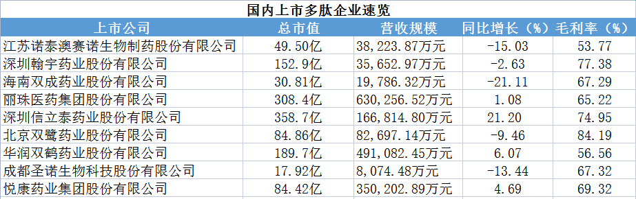 虽然国内多肽领域入局门槛高、竞争相对缓和,但受人口老龄化加速、患病率不断上升,以及政策红利和本土企业研发实力不断提升等,多肽药物的国产替代将持续加速,不容入局者懈怠。事实上,本土企业如翰宇药业、中和药业、地奥九泓、中肽生化、苏豪逸明和双成药业正在崛起,上市多肽药企市场表现良好,你追我赶、相互促进。