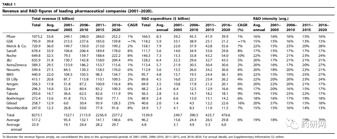 近期,Drug Discovery Today上发表了一篇文章,深度解析了全球16家头部药企在2001-2020年间(20年)的研发投入、产出和成果,并系统分析了这些药企从研发中获取商业利润的能力。