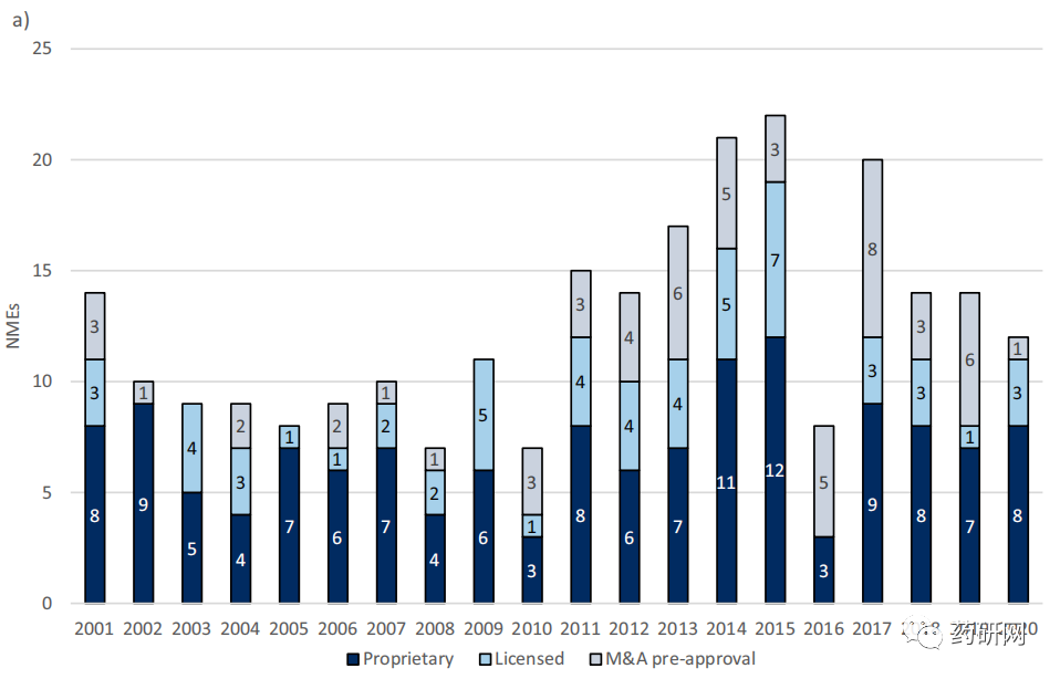 2001年-2020年间,共推出251 种新分子实体 (NME) 和新生物制剂 (NTB),占同期 CDER 相关 FDA 批准总量的 46%。这些NMEs/NTBs中,Proprietary药物占比超一半(138种)。其中2001-2007年,Proprietary数量居多;而在2009-2015年,Licensed和M&A pre-approval药物数量明显增多。