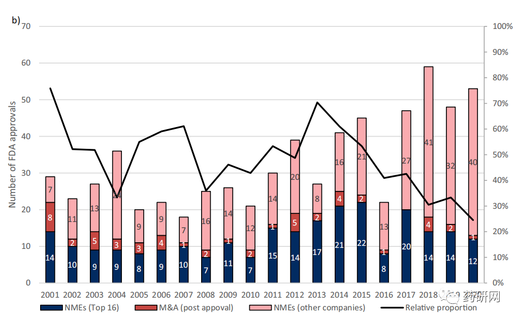 Cumulative FDA-approved NMEs/NTBs per year and origin (proprietary, licensed, or acquired before approval).20年间,16家药企获批药物数量占总获批数量的比例呈下降趋势,从76% (2001 年)下降到 25%(2020 年)。其中默沙东、辉瑞和BMS收购了大量非自身研发的新药(M&A post-appoval)。
