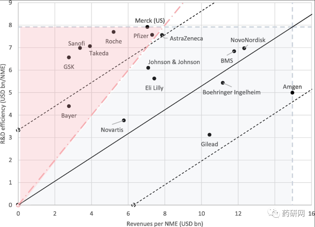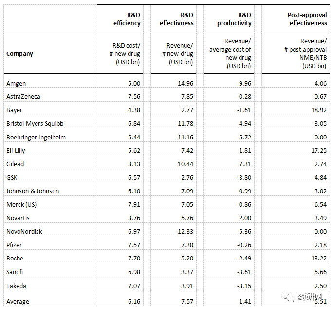 而每款新药的研发效益为75.7亿美元(平均商业化时间为 8 年),其中安进公司(商业化9.6 年)、诺和诺德(7.5 年)和 BMS (6. 9 年)的研发效益明显高于GSK(4.7 年)、拜耳(8.5 年)、赛诺菲(7.3 年)或武田(6.3 年)。