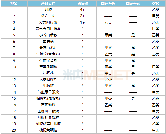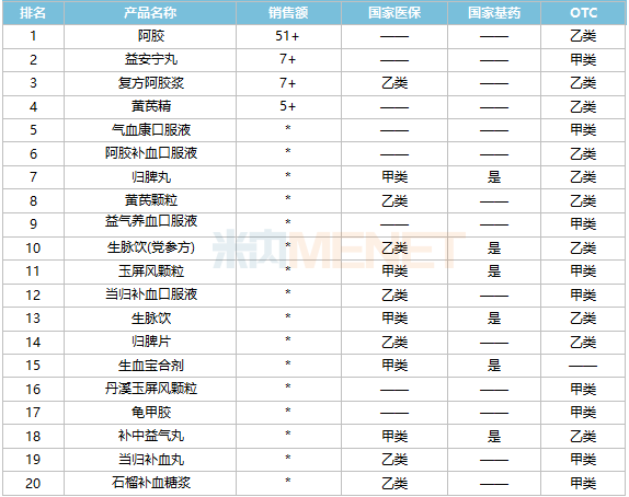 6个为独家产品,分别是益安宁丸(同溢堂药业)、复方阿胶浆和阿胶补血颗粒(东阿阿胶)、生血宝合剂(清华德人西安幸福制药)、玉屏风颗粒(国药广东环球制药)、槐杞黄颗粒(启东盖天力药业)。