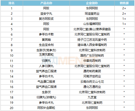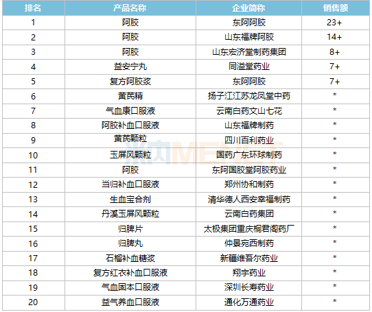 品牌TOP20中,11个销售额超过1亿元,从增速来看,山东宏济堂制药集团的阿胶、东阿阿胶的复方阿胶浆、扬子江江苏龙凤堂中药的黄芪精、国药广东环球制药的玉屏风颗粒、云南白药集团的丹溪玉屏风颗粒、新疆维吾尔药业的石榴补血糖浆、深圳长寿药业的气血固本口服液7个品牌有双位数增速。