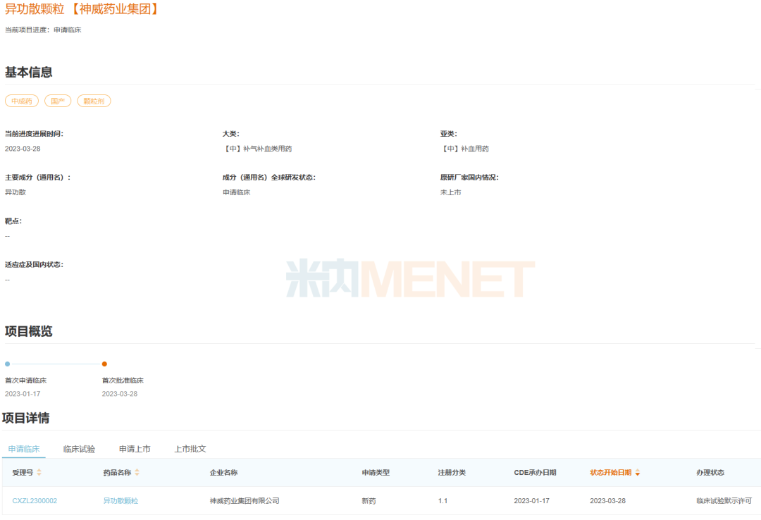 2014年至今,补气补血类中成药并无产品获批上市,而获批临床新药中,神威药业的中药1.1类新药异功散颗粒备受关注。