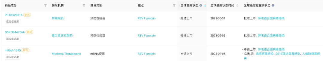 2023 年 5 月,GSK 开发的 RSVPreF3 疫苗(Arexvy/GSK 3844766A)和辉瑞的 Abrysvo(RSVpreF/PF-06928316)相继获 FDA 批准上市,成为目前全球仅有的两款 RSV 疫苗。
