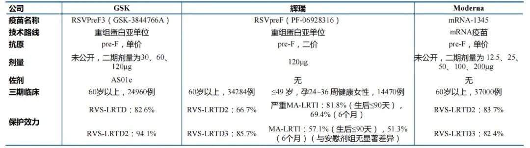 值得一提的是,这三款 RSV 疫苗在技术路线、抗原选择、佐剂、适应人群和保护效力等方面均存在显著差异。