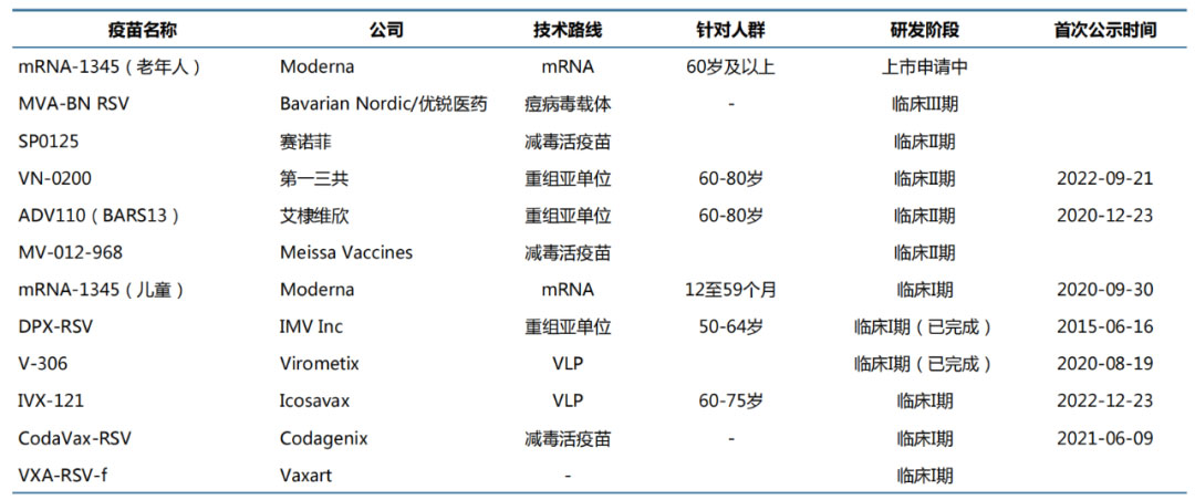 当然,除了上述三款 GSK 疫苗以外,海外企业还有不少同类产品已进入临床阶段,包括赛诺菲的 SP0125(减毒活疫苗技术路线)、Icosavax 的 IVX-121(VLP 技术路线)等,疫苗类型呈现多元化。