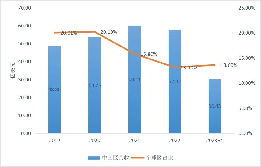 在医保和集采双重重压下,2022年阿斯利康中国区营收首次出现下滑,至57.92亿美元,全球区占比13.1%。