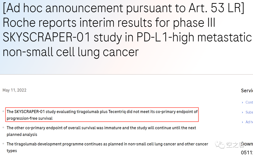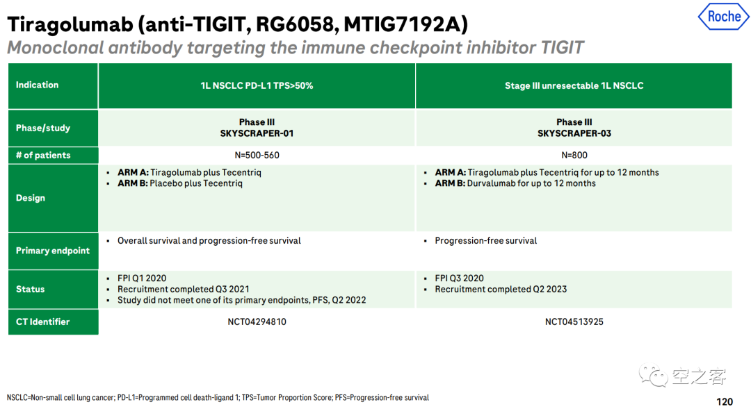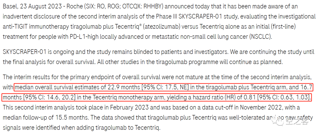 8月23日,Roche“不经意地”宣布(并不是我编的,而是原话就用了inadvertent disclosure)TIGIT单抗Tiragolumab的第二个中期分析结果。在这个代号为SKYSCRAPER-01的三期临床中(NCT0494810),共入组了534例PD-L1高表达的一线晚期NSCLC患者,按1:1分配到Tiragolumab+Atezolizumab与Atezolizumab单药组,双主要终点是PFS和OS。